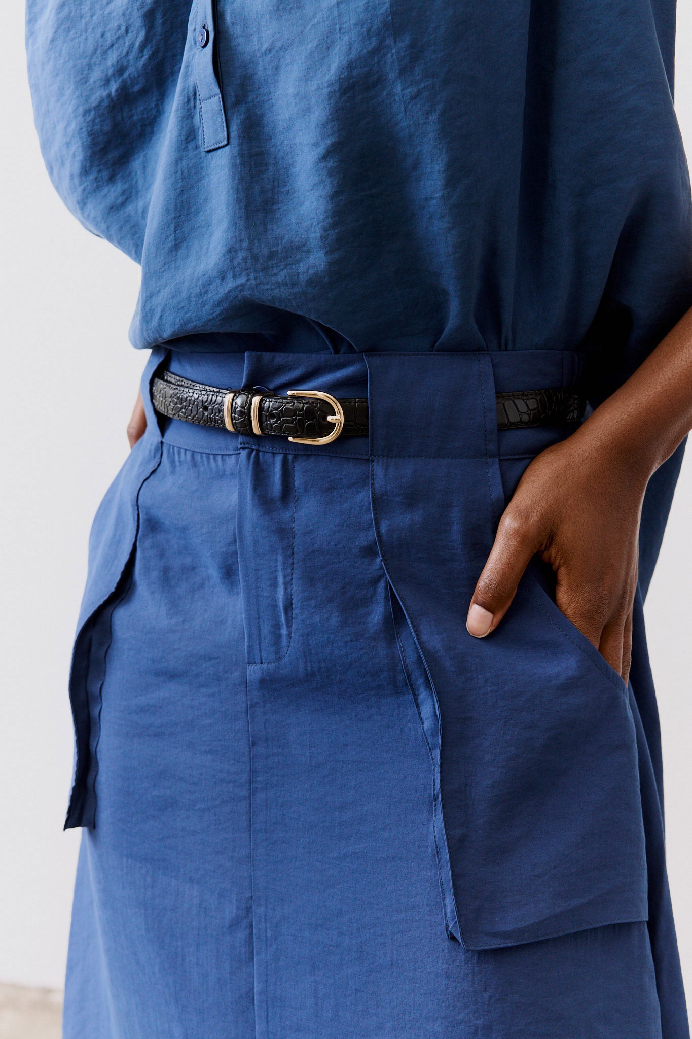 Combining practicality with flair, this Utility Skirt features functional pockets and a crisp fabric that effortlessly transitions from day to night with a touch of urban charm.
