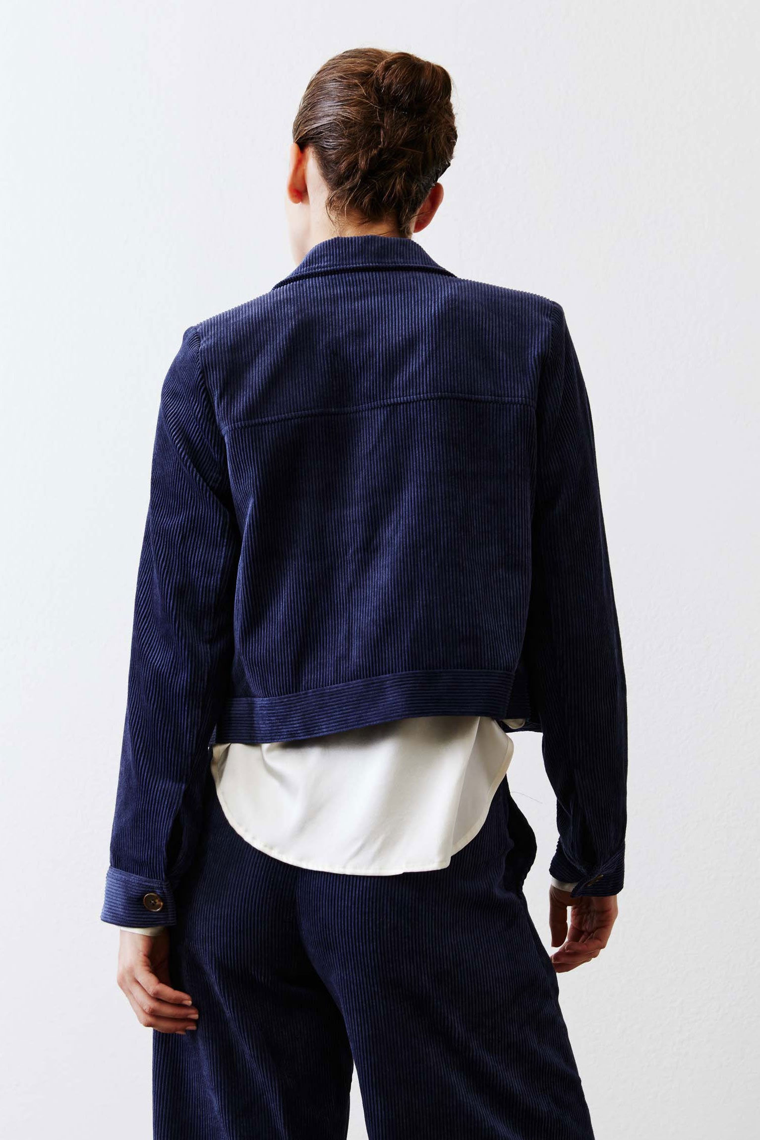 A workwear-inspired jacket reimagined in soft navy corduroy. Cropped for a modern edge, it balances structure and ease for versatile styling.