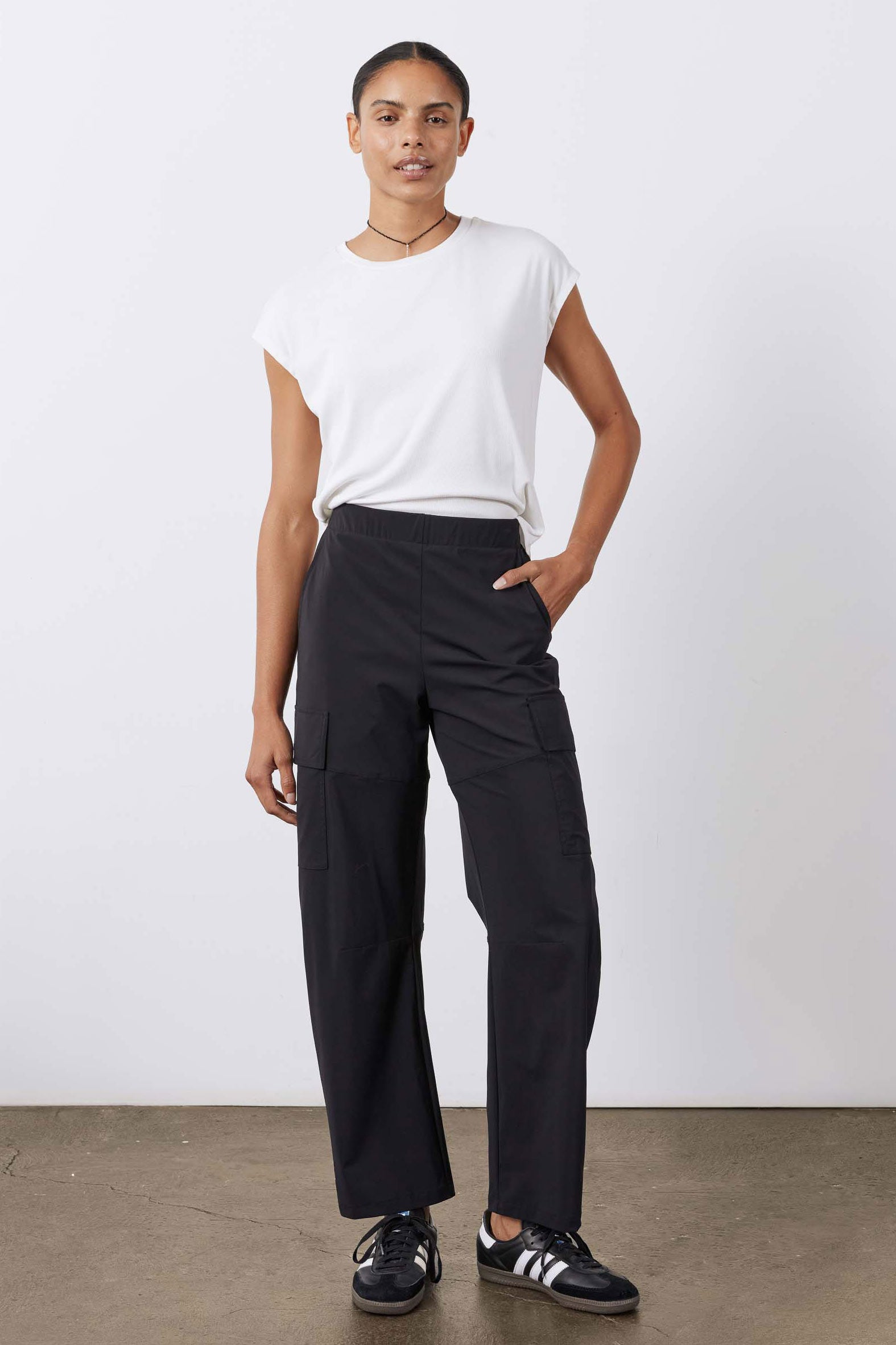 Size & Fit: Designed for a loose wide leg look, with an elastic waistband.
