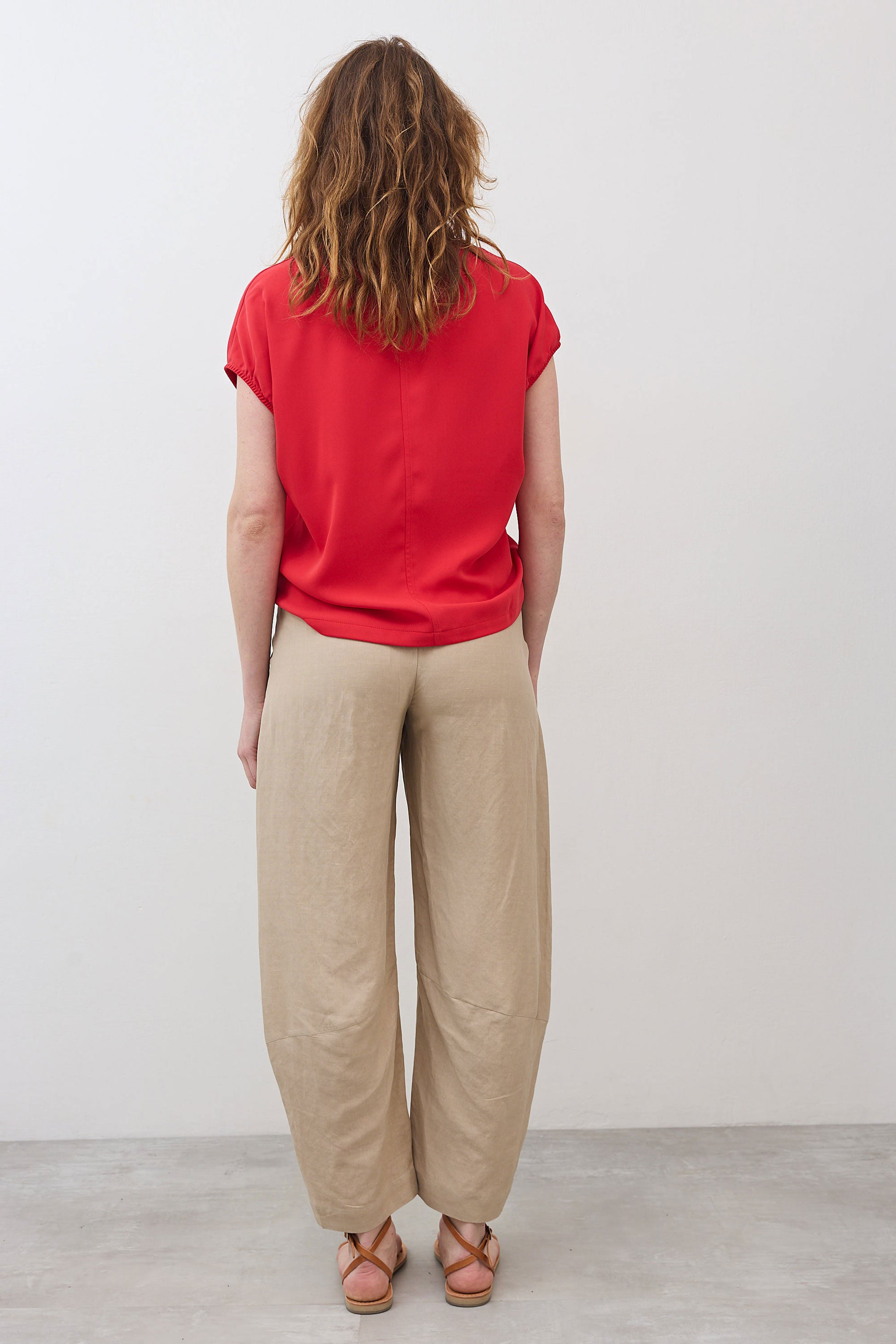 A modern V-neck cap sleeve top with subtle pleat details for a structured yet relaxed look. Designed for effortless layering or wearing solo, adding a sleek and versatile touch to any outfit.