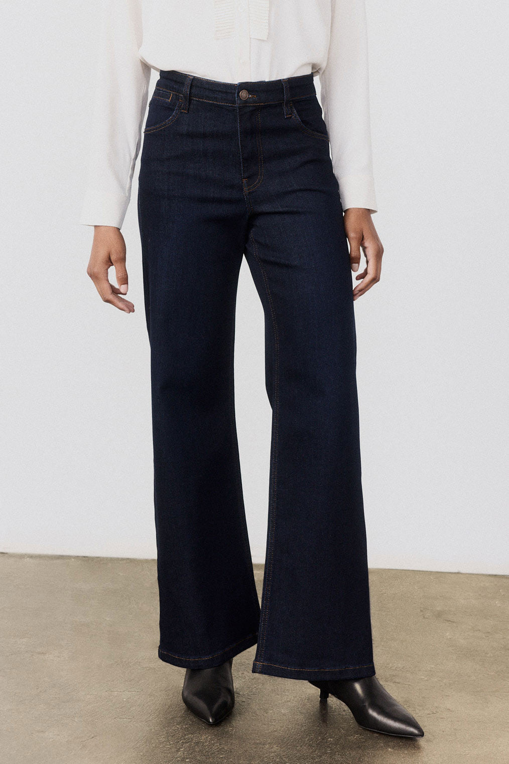 Wide-leg palazzo jeans in a rich dark wash, designed with a clean mid-rise cut. Their structured volume adds easy drama while keeping the fit versatile and wearable.