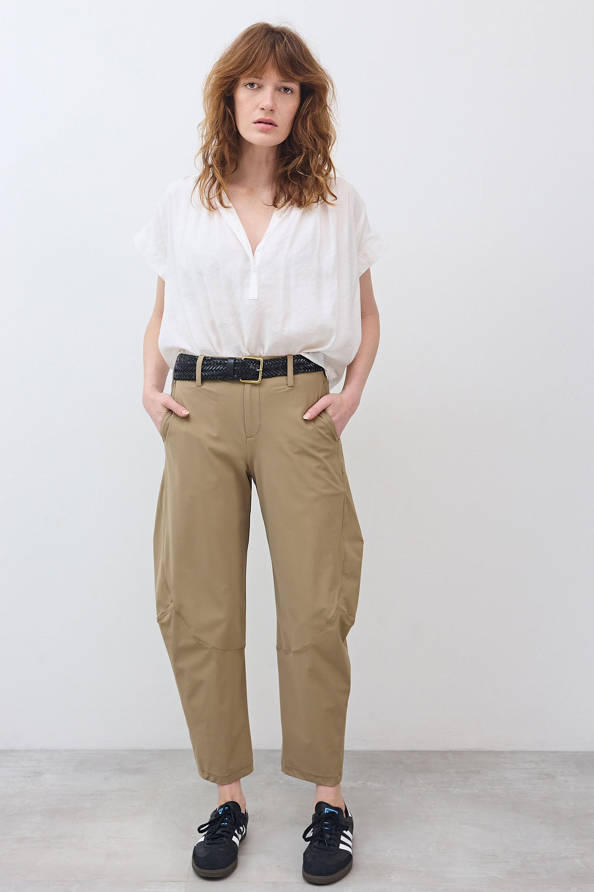 A clean, tapered shape that flatters while keeping its relaxed ease — lightweight, wrinkle-free, and made to move with you.